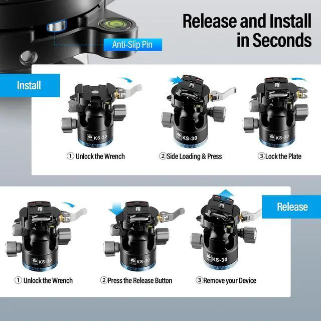 SIRUI strong aluminum alloy low gravity ball head for tripod, monopod, camera slider. 36mm diameter ball and 51mm large base diameter that can provide better stability and higher load capacity to support DSLR cameras, mirrorless cameras, camcorders, and other equipment weighing up to 20kg. Memory adjustment button help to control friction of the ball according to the load weight. With proper damping, its convenient for precise composition and adjust the heavy equipment easily. The side loading of the Arca-type QR Plate can make the equipment attachment and detachment effortless.
