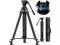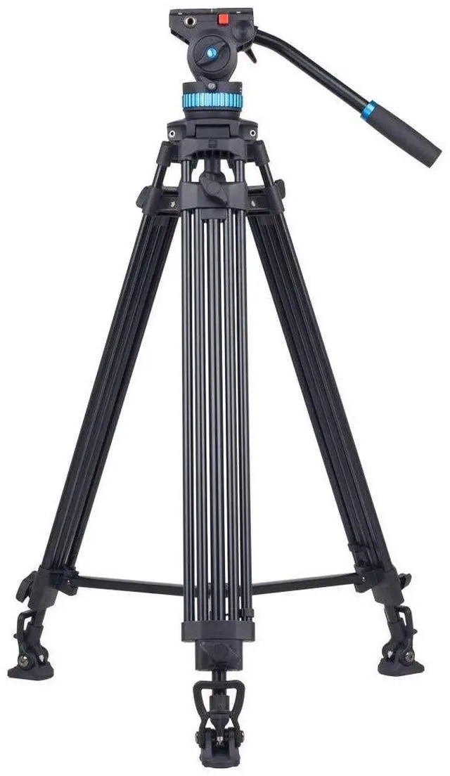 Sturdy Aluminum Alloy TripodAluminum alloy construction with strong telescopic twin legs tubes and middle spreader, the video tripod has reliable stability and support weight up to 22.0 lb/10kg. ^^ Professional Video Fluid HeadDynamic balancing system allow stepless 360 horizontal and -75to +90 vertical movements. The bottom ring can adjust the amount of tension, which make the heavy duty tripod pan from left to right for smooth and stable movement while recording. ^^ Quick Height AdjustmentThe 3-section telescopic legs tripod height can be adjusted easily and rapidly from 36.06" (91cm) to 74.8" (190cm) with oversized leg locking knobs and buckles.