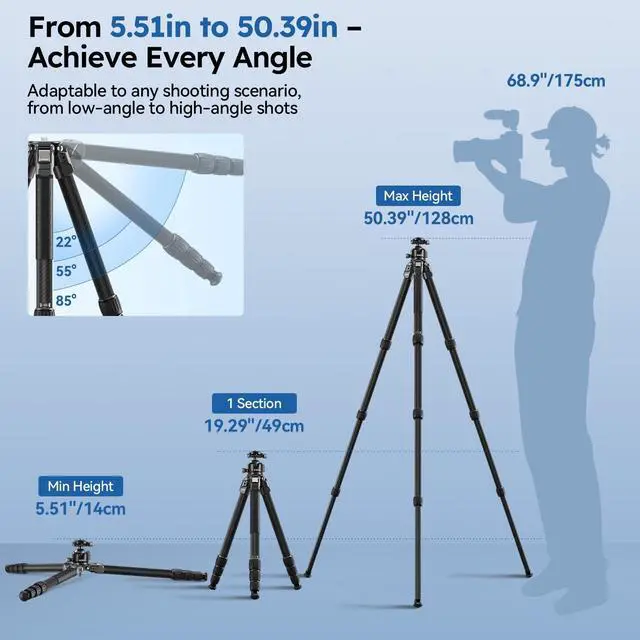 [Premium Carbon Fiber Construction]-Crafted with high-grade, anti-corrosion carbon fiber for exceptional durability and a smooth, comfortable touch. The material is lighter than aluminum yet stronger, ensuring long-term reliability in all conditions. ^^ [Oversized 43mm Low-Profile Ball Head]-Features a larger-than-industry-standard 43mm diameter ball head with low-center-of-gravity design for rock-solid stability and zero creep, even with heavy gear. ^^ [Heavy-Duty Performance]-Supports up to 20kg (44lbs), making it ideal for DSLRs, mirrorless cameras, telephoto lenses, and cinema rigs. The aerospace-grade aluminum alloy joints enhance structural integrity. ^^ [Portable & Complete Kit]-4-section legs extend from 5.7" ( 14.5 cm) to 50.4" (128cm) and fold down to 20.5" (52cm).