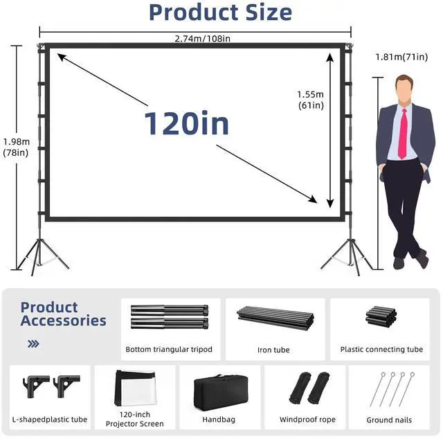 [Excellent Projection Display] -120-inch outdoor projector screen with stand, 16:9 aspect ratio, and 160 degrees wide viewing angle. The Vamvo portable projector screen will become your best friend. The movie screen is designed to provide clear, high-resolution images, rich colors, and an excellent viewing experience in different viewing positions. When using it, you'll feel like you're in a movie theater whether you're by yourself or sharing a fun time with family and friends. ^^ [Lightweight and Detachable tripod] -The stand is not only advanced and beautiful but also lightweight and durable, making it not easy to bend, deform, and break.
