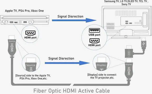 Active HDMI Cable: The HDMI fiber optic cable is an active HDMI cable, and active HDMI cable meaning that require stable power to work, it needs enough power to work properly