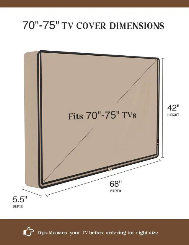 Find The Right Fit: Available in the perfect size for your outdoor TV, our cover measures 68 inch wide, 42 inch high, 5 inch deep. Before purchasing, be sure to measure your TV to ensure a proper fit ^^