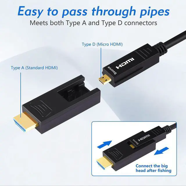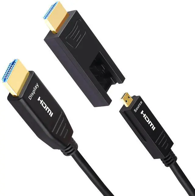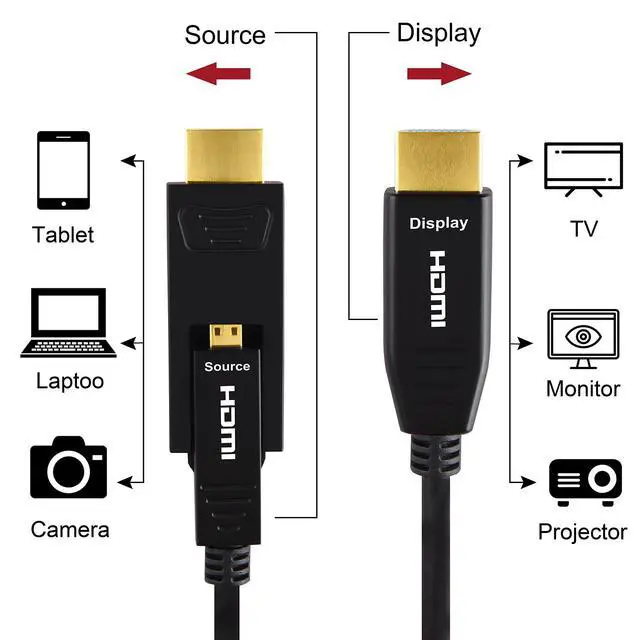 Micro-HDMI to HDMI cable, directional fiber optic cable, connects Micro HDMI device to HDMI device. Please check your device and make sure source device is Micro HDMI port, and display device is standard HDMI port. ^^ This 100 Feet 31 Meter fiber optic cable supports 4K 60Hz, 2K 60Hz, 1080p 60Hz with life-like color. ^^ Support 3D, HDR, UHD, HDCP, Audio Return Channel, HDMI Ethernet Channel, Compatible with Dolby TrueHD, and DTS-HD Master Audio. ^^ Compatible with Raspberry Pi 4, GoPro Hero 7 Black, Hero 6 Hero5, Hero 4 Silver, Hero 3 White, Hero3+, Go Pro Hero 2018, Sony A5000 handycam, Sony A6500 A6000 A6400 A73 A7S camera, Nikon b500, Canon EOS M50, IdeaPad Miix 300 Tablet, Ideatab Miix 700 Miix 2 710 S6000, ThinkPad 10 8, Yoga 2 Pro 3 ultrabook, Yoga 700 710, 710s, ASUS ZenBook UX305UA, Transformer Mini T102HA.