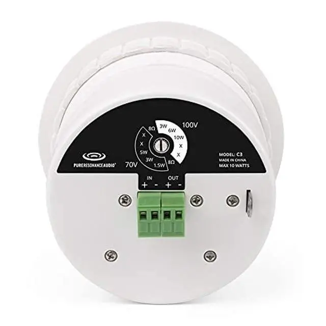 Compact and lightweight, the Pure Resonance Audio C3 3" micro ceiling speaker system is an intelligent, stylish design that seamlessly blends into ceilings while producing quality sound and excellent dispersion of both music and vocals. Because of its small size, the C3 ceiling speaker is great for installations where architectural or aesthetic considerations require a small format ceiling speaker. It features an 8 Ohm and 70 Volt tap, as well as a power tap transformer switch which allows for selectable inputs of 8 Ohm or 70V/100V applications. The C3 ceiling speaker is perfect for providing background music, paging and ambient sound masking for offices, retail stores, coffee shops, restaurants, hospitality venues, reception/waiting rooms, lounges, foyers, hallways, and auxiliary spaces.