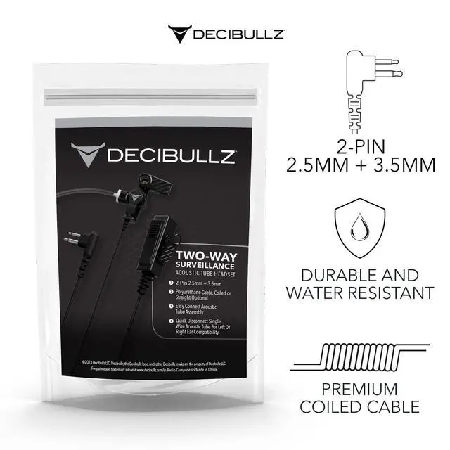 Decibullz Two-Way surveillance Acoustic tube headset ^^ Clear coil cable & Earpiece Audio Set for two way radios, Radio speaker 2-Pin 2.5MM 3.5 MM threaded audio jacks ^^ Strain Relief & water resista