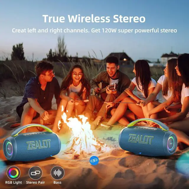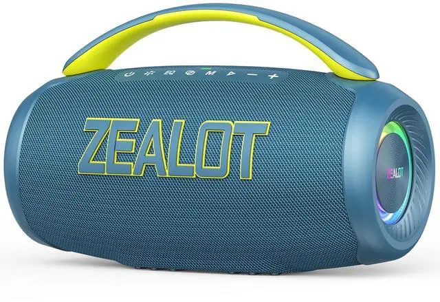 Born to Outdoor- 80W PeakZEALOT unique Pure Sound of body-shaking XBass technology from 13 years of sound engineering. Two loud speakers (1 tweeter and 1 bass woofer). The portable bluetooth speakers deliver crystal-clear highs, deep bass, and a rich, balanced audio profile. By the DSP chip support, rich and smooth zero-distortion sound, and high-frequency sound up to 40kHz is significantly clearer ^^ Bluetooth 5.3 Streaming Fast Bluetooth pairing and good high and low frequency response. In addition to Bluetooth pairing, sources can be physically connected with USB port, 3.5 auxiliary port and TF port (for micro USB card) up to 50ft wireless range, and keeps fast Stable Bluetooth connection and signal transmission ^^ IPX6 Waterproof & Portable Handle DesignCertified by IPX6, no need to worry about splashing water, rain, accidental spills or dust.