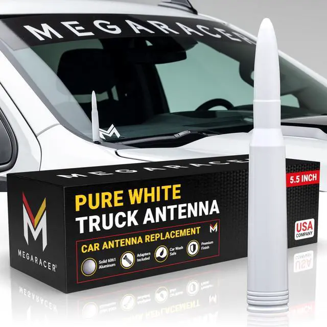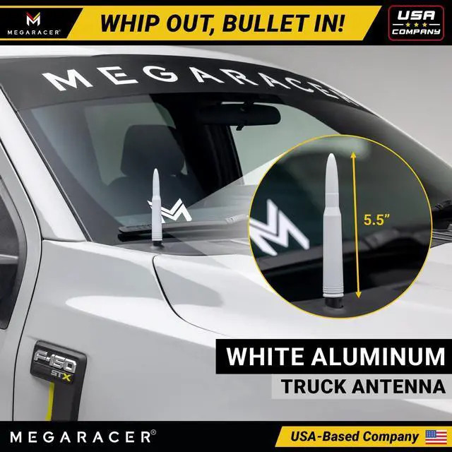 Gloss White 50 Cal Bullet Antenna for Truck - Fits Ford F150 F250 Bronco RAM 1500 Chevy Silverado GMC Sierra Tundra Tacoma - Billet Aluminum, UV & Chip Resistant, Car Wash Safe, Short Replacement