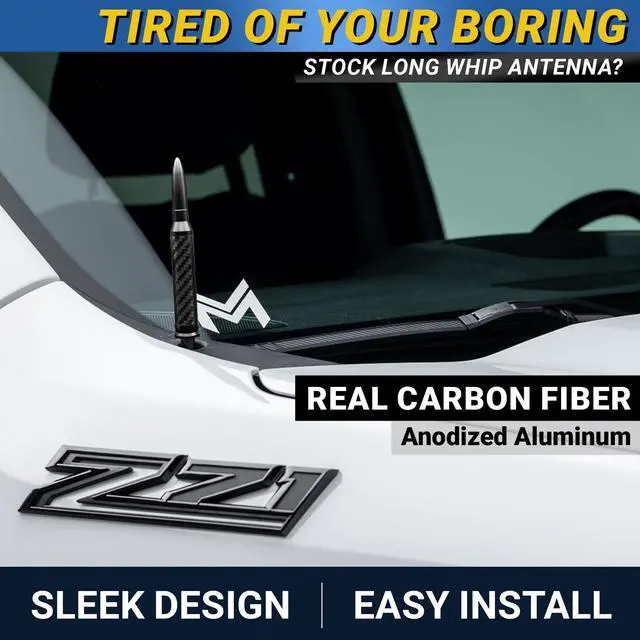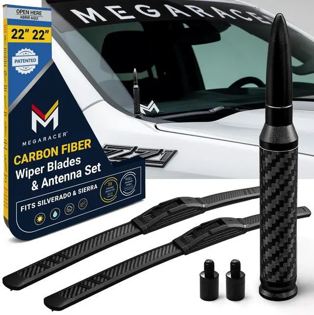 • Chevy Silverado & GMC Sierra (Year 2019-2026) Combo Set - Carbon Fiber Antenna + Patented OEM Windshield Wiper Blades 22"+22" - Truck Accessories for Men, Birthday, Fathers Day Gifts for Dad, Men, Him