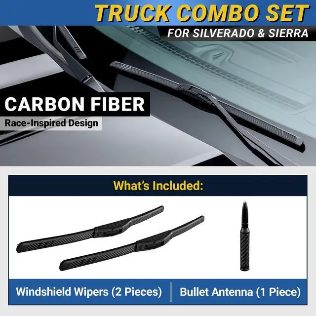 Carbon Fiber Combo Set, Fits Chevy Silverado & GMC Sierra (Year 2019-2026) Patented OEM Front Windshield Wiper Blades 22"+22" + Short Antenna, Truck Accessories, Gifts for Father Dad Men Him