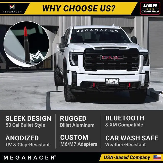 Perfect Fit Antenna True 1:1 Size Ratio Specifically engineered to fit Chevy Silverado and GMC Sierra 1500, 2500, and 3500 models from Year 1999 to 2026. This antenna gives your truck an authentic, rugged look. Installs in minutes with no modifications, seamlessly replacing your factory antenna for a clean, upgraded appearance. ^^ Custom-Made Fit with M6 & M7 Adapters Weve carefully sourced and included both M6 and M7 threaded adapters to ensure a custom fit for more vehicles. This added compatibility extends beyond Silverado and