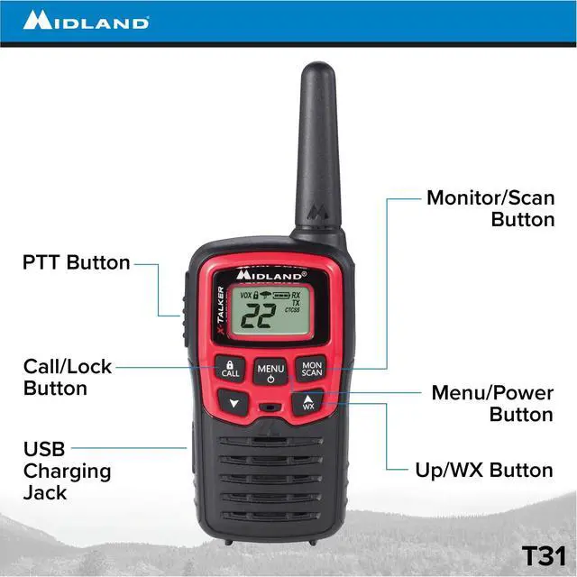 The Midland T31VP x-talker Walkie Talkie is an easy-to-use, license-free, and low cost yet reliable solution to long-range communication. It is a water resistant radio that provides clear point-to-point communication, reception, transmission, and sound quality. Connection to other FRS/GMRS two way radios is limitless as long as you connect to the same channels/frequencies. The T31VP features 38 privacy codes, 22 scannable channels, eVOX - Hands-Free Operation, and easy button access. Unlike other FRS walkie talkies on the market that use lithium batteries, the T31VP x-talker has dual power options - use 300mAh rechargeable batteries (X2) or 3 AAA Alkaline batteries each (not included).