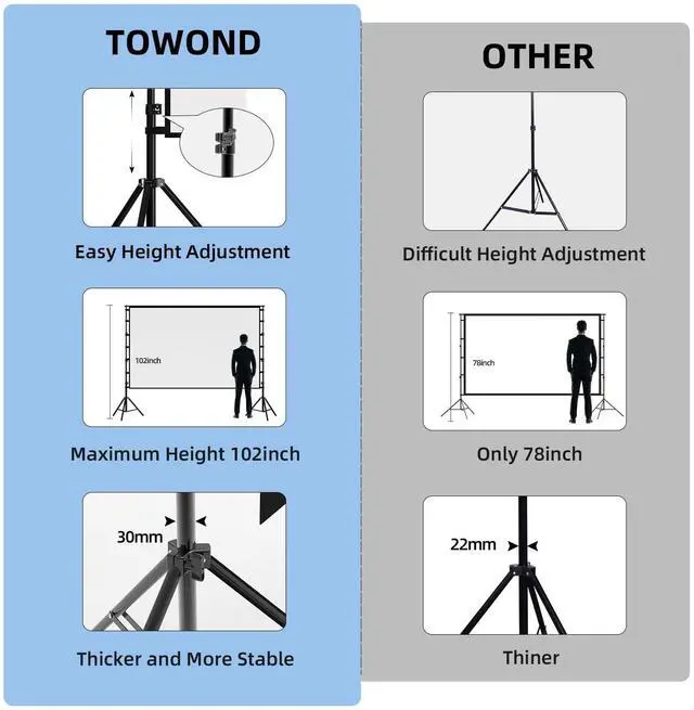 Projector Screen with Stand. 150-inch diagonal, 160wide viewing angle, aspect ratio 1:1 and 16:9 4k HD portable projector screen is made of high quality natural polyester fiber. Towond projector screen offers sharp and bright images. Thick and anti-crease design giving you more fun, even support FRONT and REAR projection. ^^ Easy to Set Up. The outdoor movie projector screen comes with a foldable stand that can be easily assembled and disassembled without any tools. You just need to unfold the stand and the elastic cord inside will drive the stand to connect quickly and automatically, so you can easily finish the installation in 2 minutes.