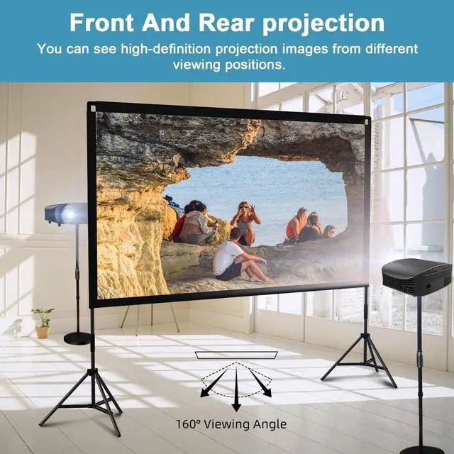 Polyester fabric: The 120 inch projector screen features a 16:9 format and a 160 Wide Viewing Angle, perfect for 4K HD projection. Unlike ordinary screens, it is made of thicker Polyester fabric material, ensuring enhanced durability. The foldable and washable design adds to its portability and makes it easy to clean. That offers sharp and high-resolution images, even support front and rear projection. Immerse yourself in the fun! ^^ Resistant and