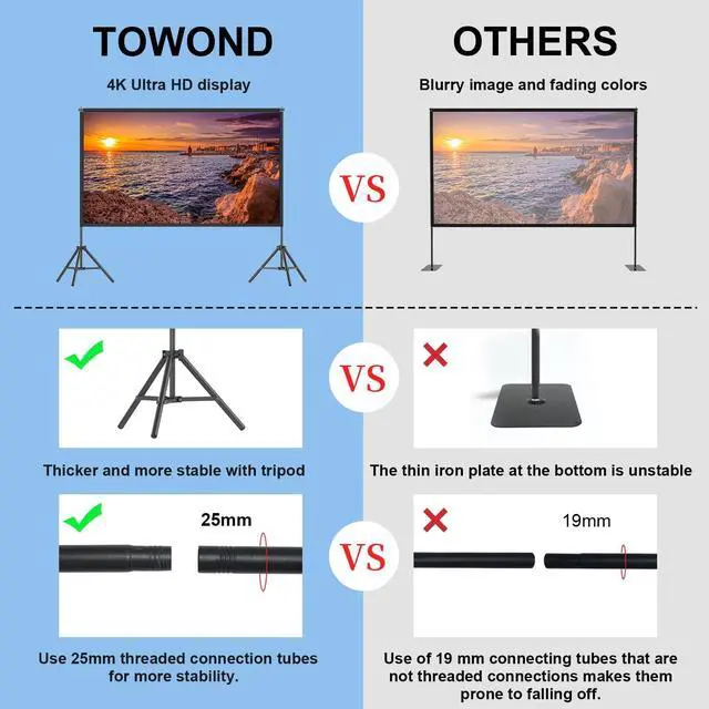 Projection Screen: The portable projector screen is made of high-quality natural polyester fiber, which can bring a clearer effect when projected onto the screen. And after we have tested the screen many times, we have thickened it. While enhancing clarity, it also is wrinkle-resistant. ^^ Easy to Set Up, Stable