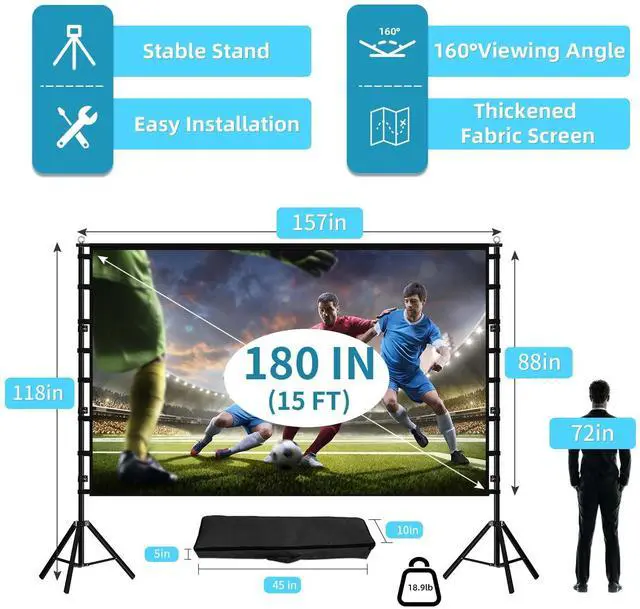 Screen and Stand: 180-inch diagonal, 16:9 aspect ratio, 160 viewing angle, 4K Ultra HD, 3D projection. The extra-large screen size can bring the ultimate viewing experience. Whether you are alone or with your family and friends you can enjoy the excellent viewing experience brought by this screen on any occasion. ^^ Easy to