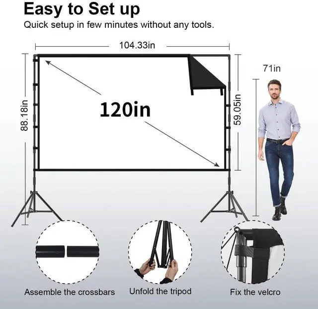 Set Up: Outdoor projector screen includes a user-friendly instruction manual for effortless setup in just a few steps. Its detachable crossbar requires no tools for assembly, and the tripod opens swiftly for instant use. Designed for outdoor durability, the projector screen outdoor equipped with grounding spikes, windproof ropes, and sandbags to ensure stability even in windy conditions.