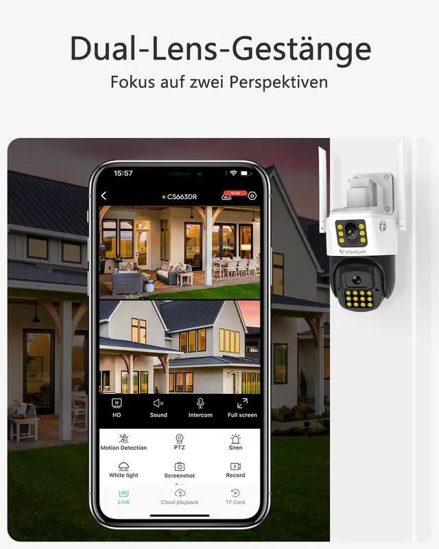 Clear Night Vision&Two-Way AudioThis WiFi outdoor camera has 18 lights built-in and guarantees night vision images in colour/IR for up to 30M.3MP HD Camera, dual lens captures fine details sharply.The spotlight is triggered by motion and can be turned on and off manually.VSTARCAM WiFi outdoor camera has a built-in speaker and microphone, so you can talk to visitors in real time or warn unwanted intruders while you're out of home.