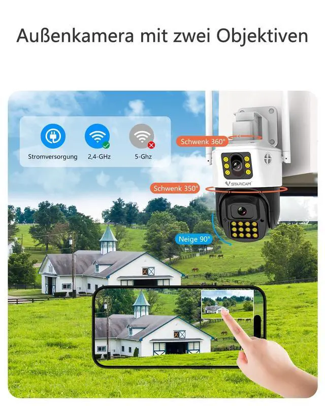 Full Coverage with PTZ CameraVSTARCAM Camera Intelligent 350 pan and 90 tilt,With two lenses, even blind spots are monitored, truly all-round without blind spot. Simultaneous monitoring from different angles, blind
