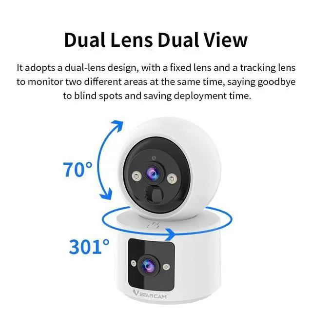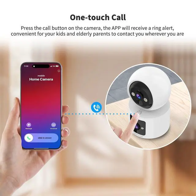 2 LensDual lens, dual screen simultaneous monitoring and storage ^^ One-Tap CallOne click call to family, care for the elderly and young ^^ PIR Motion Detection PIR human body sensing detection, more accurate, sends alerts ^^ Color Night VisionSee every detail in sharp ^^ Two-Way AudioBidirectional voice, remote voice warning