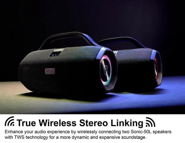 STEREO SOUND: Delivers 25W x 2 of powerful, full-range audio with deep bass and great frequency response for parties, home use, and outdoor fun. ^^ TWS +