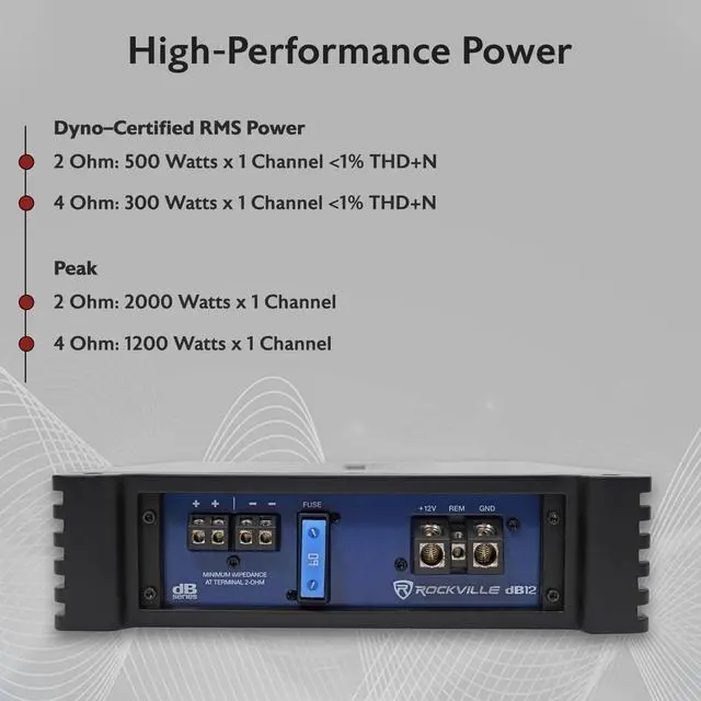 High Power Output: Delivers 2000W peak power, 500W RMS at 2 ohms, and 300W RMS at 4 ohms, ideal for powering subwoofers with deep, clear bass.