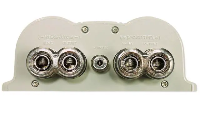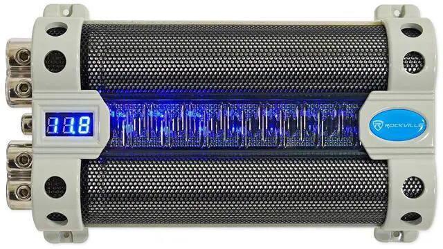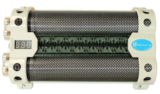 The Rockville RFC50F v2 50 Farad Digital Hybrid Car Audio Capacitor is engineered to enhance power stability and sound quality in high-performance car audio systems. With an impressive 50 Farads of capacitance, it delivers rapid energy to your amplifier during peak demand, reducing voltage drops and audio distortion. This capacitor features a 3-digit super bright blue LED display for real-time voltage readings, accurate to +/- 0.1VDC. A blue illuminated window flashes in sync with the music, while a black wire mesh cover adds a sleek, durable finish. Built-in IC-controlled circuitry provides over-voltage protection at 17.5V, under-voltage alerts at 10V, and warning tones for incorrect polarity connections.