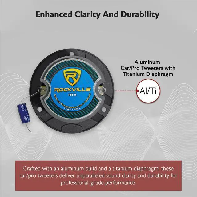 Pair Rockville RT5 2.8" aluminum car/Pro tweeters with titanium diaphragm and kapton vc 1" high temperature die cast kapton voice coil extremely loud and Clear highs with an amazing frequency response that can even play some mid Ferro fluid enhanced voice coil cooling shallow mounting depth 10 oz magnet includes mounting hardware impedance: 4