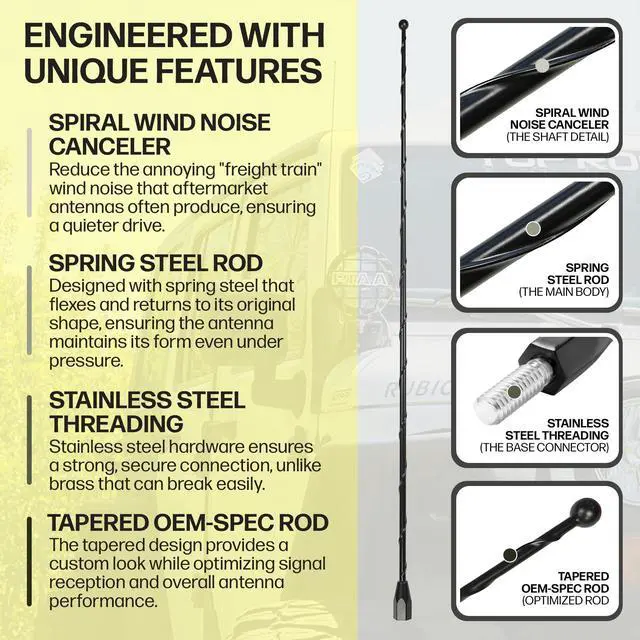 2) Wind Noise Cancellation Wrap. On our spring steel antennas we now offer with the feature that will get rid of the highway whistles aftermarket antennas are prone too. This noise without our noise cancellation feature is referred to as a noise of a freight train. This is a unique feature and should not be one overlooked. 3)The supporting hardware of our antenna is made of 304 stainless steel. Brass is often used with a lot of aftermarket antennas. This is because brass is softer material and easier to cut and manufacture. Downside is brass is it's a weak material and often snaps with minimal force.