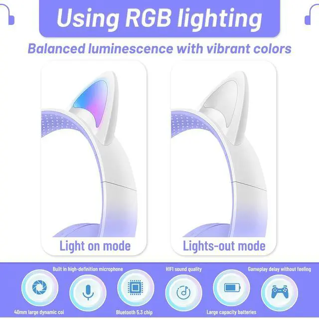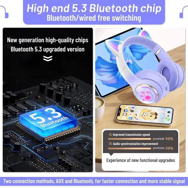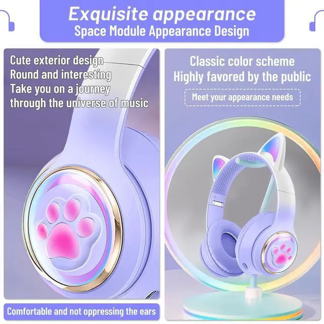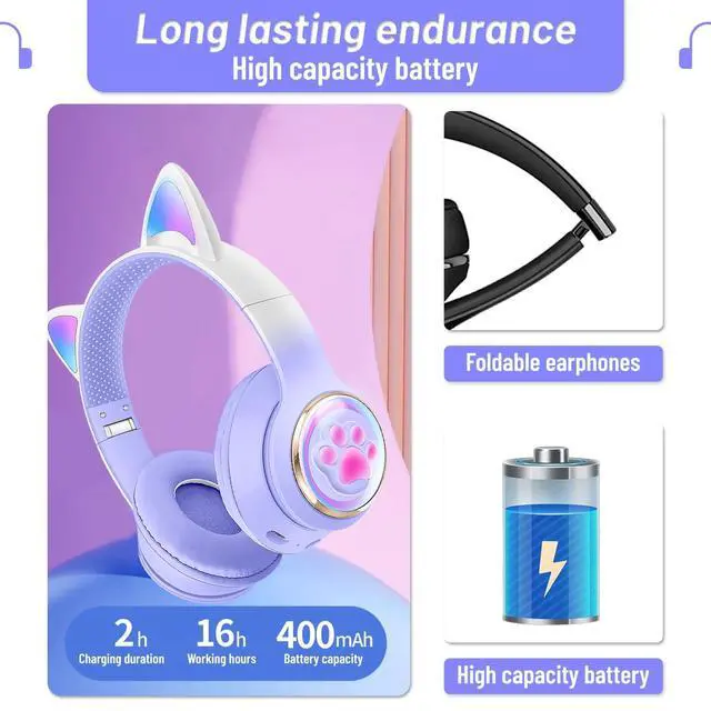 Kid-Friendly DesignThese Bluetooth headphones are specially designed for kids with adorable cat ears and paws to make them look stylish and fun. ^^ Wireless ConvenienceThese kids' wireless headphones connect to any Bluetooth-enabled device with ease, allowing kids to enjoy their music or video games wirelessly. ^^ Superior Sound QualityThese Bluetooth headphones for kids feature powerful and balanced audio technology, delivering crystal-clear sound for an immersive experience. ^^ Safe Listening These Bluetooth headphone ear cups are designed to be safe for kids' ears, limiting the maximum volume to protect their hearing from damage. ^^ Ideal Gift ChoiceThese wireless headphones for kids make an excellent gift for any child who loves music, gaming, or watching videos on their devices, making them a perfect birthday or holiday present.