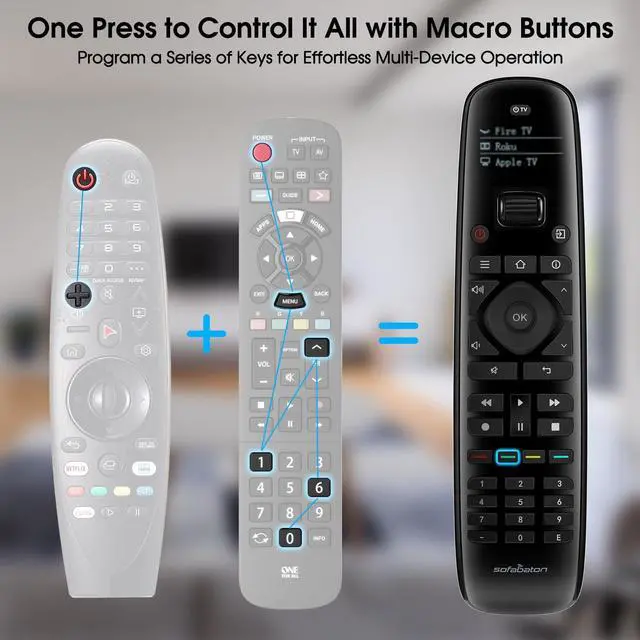 Major Upgrade: Backlit Buttons for Effortless OperationThe U2 smart universal remote control introduces backlit buttons, a major improvement that ensures you can effortlessly operate your remote in any lighting condition. Whether you're enjoying a movie night in the dark or controlling your devices during the day, the backlit buttons offer a clear and convenient control. This enhancement significantly improves usability and sets the U2 apart from its predecessor ^^ One Press Does it All with Macros Execute complex commands with a single click using the Macro Button. Power up your TV, activate your soundbar and launch your streaming deviceall at once. Customize macros to match your routines, saving time and simplifying your life ^^ Smart Setup via SofaBaton APPThe SofaBaton APP offers an easy and intuitive setup process. Add devices by entering brand and model in seconds. Options for infrared, Bluetooth, or learning modes. Use the APP to organize buttons, create macros, and even control devices remotely within short distances. Tailor your programmable remote control to fit your needs with features like "Reassign Buttons" "Reorder Functions" and more ^^ Customizable Button AssignmentsYou can personalize your universal remote to match your preferences by reassigning buttons through the cloud codebase.