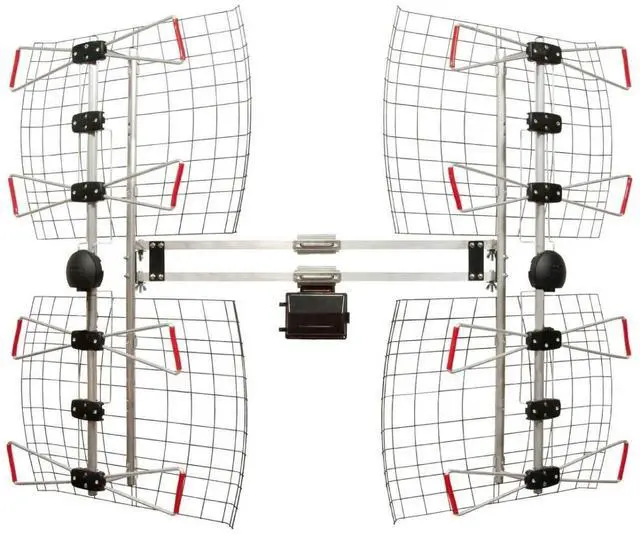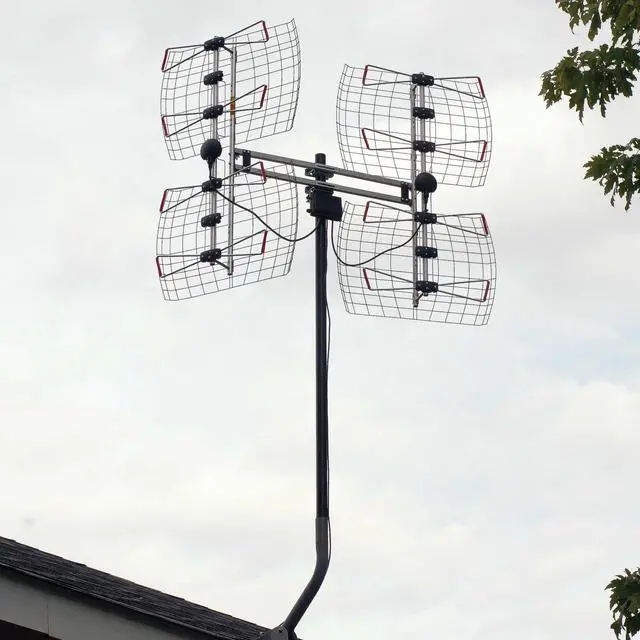 Antennas Direct 8-Element Bowtie HDTV antenna - Has a range of 70+ miles and patented, multi-directional, specially designed brackets that allow the antenna to turn in different directions to target transmitting towers ^^ Bowtie antenna measures 36.8" H x 50" W x 10" D; ideal for rural and suburban installations challenged by heavy foliage or roofing materials ^^ Compatibility - NEXTGEN TV, 4K, 8K UHD, Full HD 1080p, no Internet required ^^ Each market has TV towers located in different areas; Distance to the towers and obstructions like trees and your homes building materials will affect reception; an antenna cannot provide cable TV channels ^^ Reflectors add forward gain and focus the antenna's power to protect incoming TV signal from interference that causes pixelation or complete loss of picture