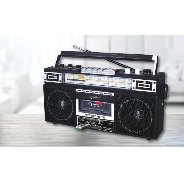 Elevate your music experience with the Supersonic (R) AM/FM/SW World-Band Receiver Boom Box, striking the ideal balance between nostalgia and modern functionality. This boom box appeals to kids and adults alike, thanks to its cassette player for a trip down memory lane and its compatibility with USB, SD (TM) Cards, and Bluetooth (R) for contemporary music streaming. Whether you're grooving to your favorite 80s hits or exploring the latest tracks, this boom box offers a 360deg antenna for crystal clear radio reception and a 3-band EQ mode for a tailored audio experience.