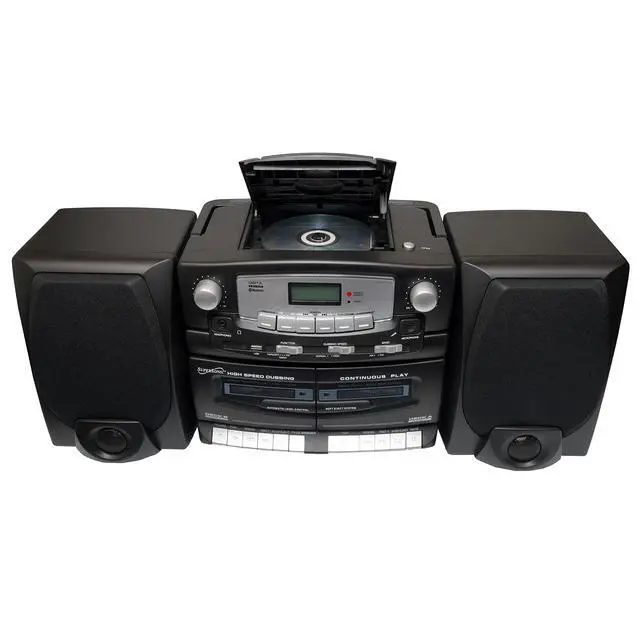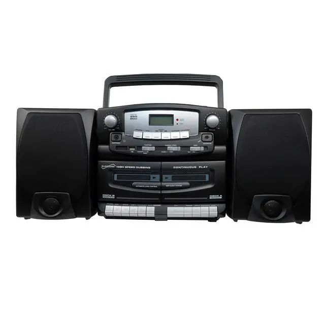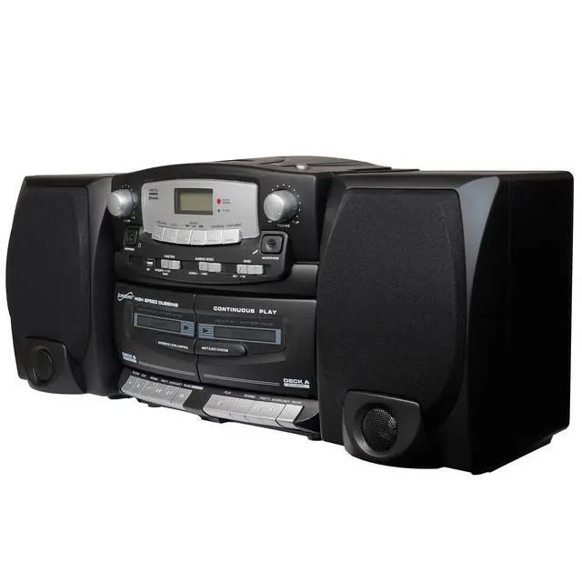 USB Input Compatible: Play Media Devices Such as Flash Drives and MP3 Players Double Cassette Recorder Record from CD, Radio or Built-in Microphone Built-in Microphone Programmable Track Memory 2 Dynamic High Performance Detachable Speakers Play/Pause, Search, Skip, Repeat Functions Rotary Volume Control Telescopic FM Antenna Remote Control Included Headphone Jack AC 110/220V Operated