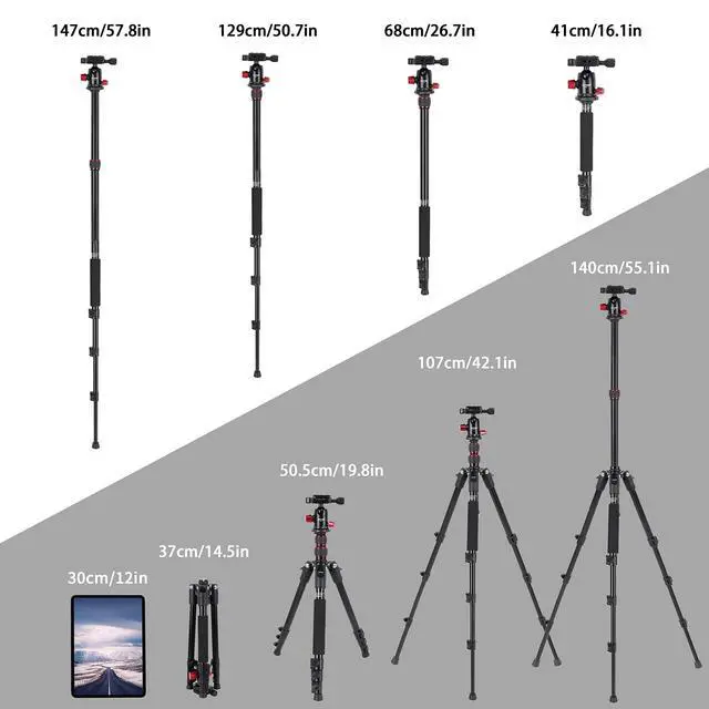 • Multi-functional: This tripod is designed with double telescoping center columns, compact when folded and practical when extended.Support for macro photography, can be used as a alpenstock and monopod.