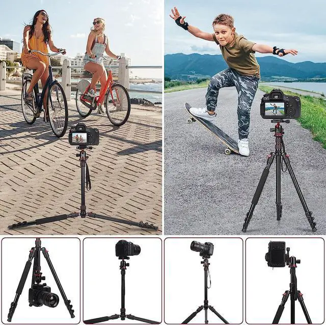 • Upgraded TripodUnique 2-piece center column design allows you to increase the maximum height of tripod and monopod; 4-piece legs with quick release buckle. The working height can be adjusted in seconds between 60 cm and 195 cm, which is even more suitable for the photographer's striving for the tripod height