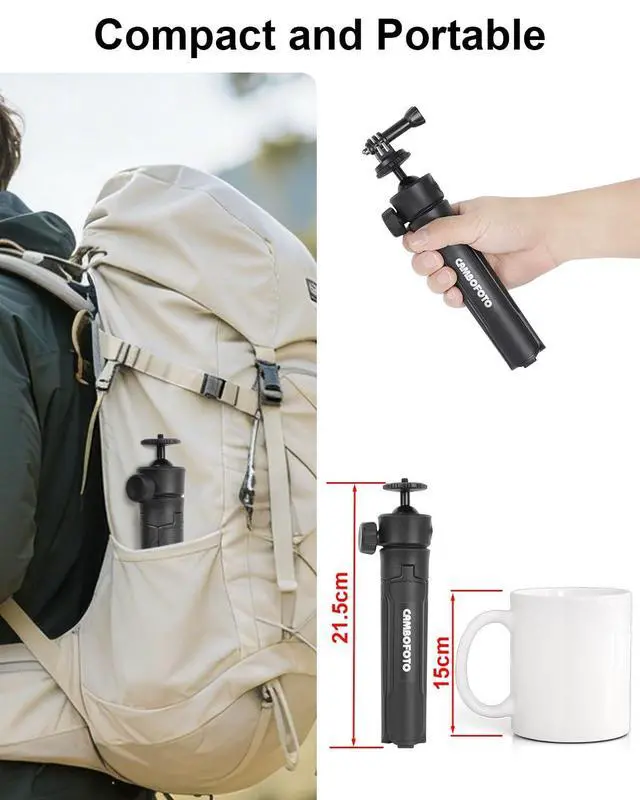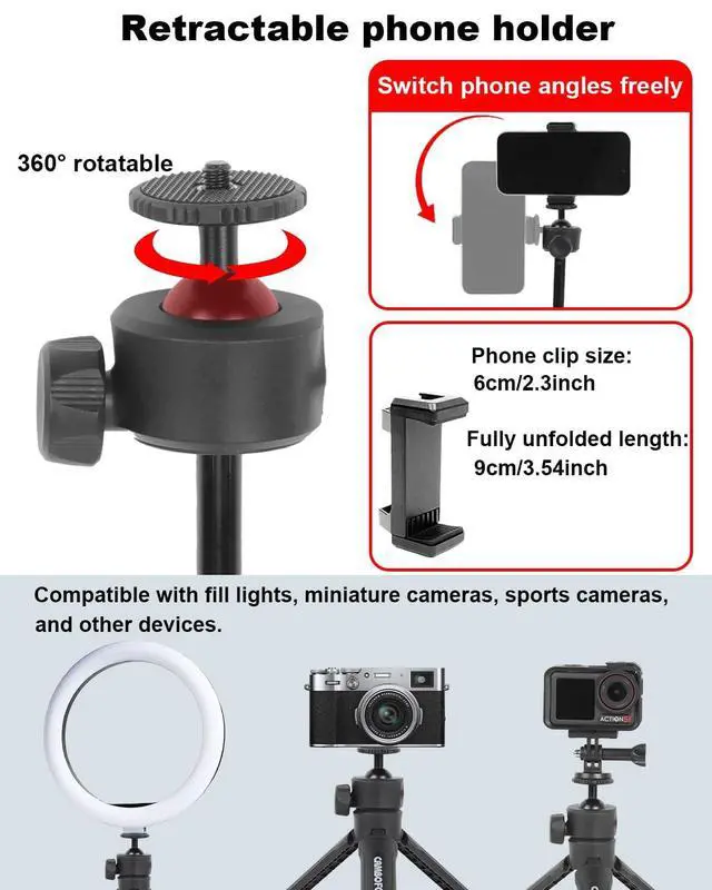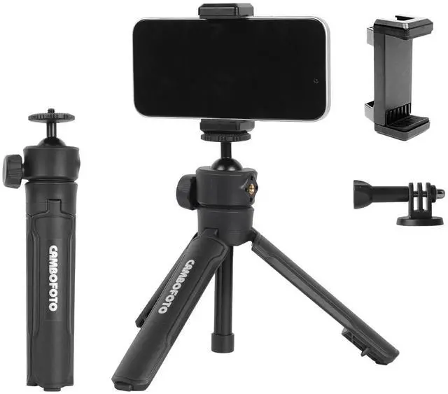 Action Camera: This mini tripod comes with a phone holder and action camera mount, making it compatible with most smartphones and action cameras. Whether youre recording a video, taking selfies, or shooting outdoor adventures, its the perfect versatile tripod for all your gear.