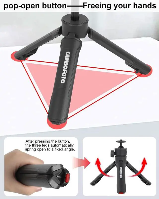 Perfect Angles: Capture shots from any angle with the 360 rotating ball head. Whether you're vlogging, shooting tutorials, or snapping product photos, you can adjust the tripod quickly for the perfect frame. ^^ Quick Lock Foldable Design for