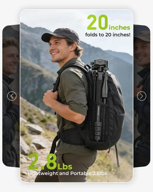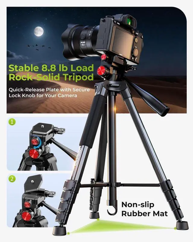LIGHTWEIGHT 72-INCH TRIPOD This portable tripod extends from 19 to 72 inches, giving you the flexibility needed for low-angle shots, standing interviews, or overhead filming. It uses a 1/4-inch quick-release plate compatible with most cameras and smartphones. When folded, it measures only 20 inches, making it easy to pack for travel. Despite weighing just 2.8 lbs, it can securely support equipment up to 8.8 lbs. ^^ UPGRADED HEAD LOCKING & QUICK-RELEASE DESIGN Our upgraded head locking system and redesigned quick-release plate significantly improve stability during setup. The camera stays firmly in place when mounting or tightening, and the new alignment grooves help ensure more accurate positioning throughout your shoot.
