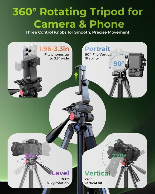 Every component is tuned for smoother motion and accurate tracking without stiffness. ^^ UNIVERSAL COMPATIBILITY & MULTI-PURPOSE USE This versatile tripod works with cameras, mirrorless cameras (CSC), projectors, ring lights, and smartphones. Its suitable for photography, travel, hiking, sports, events, parties, YouTube videos, vlogs, live streaming, and online meetingsmaking it a dependable all-around shooting companion. ^^ RELIABLE CUSTOMER SUPPORT If you encounter a manufacturing issue, please contact us through Messaging. Our team will respond within 24 hours and offer a solution in line with s policies.