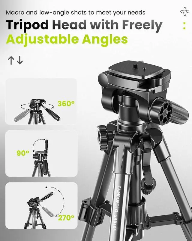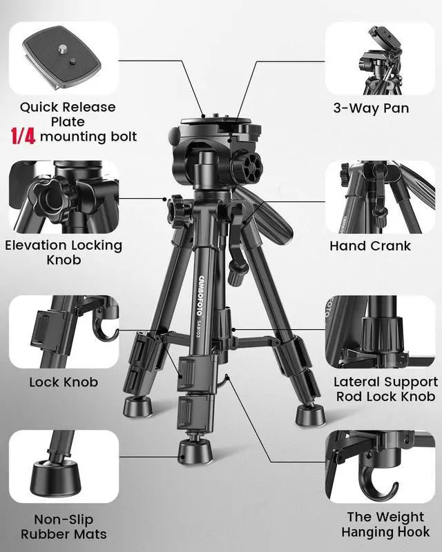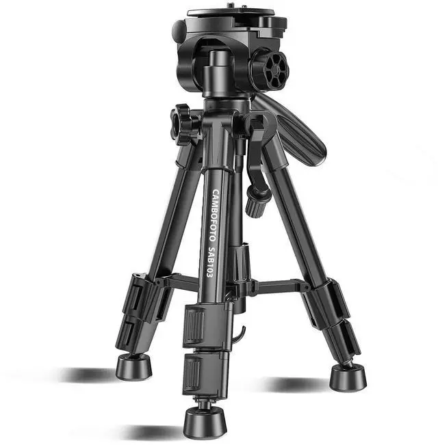 2010. We pride ourselves in providing an extensive range of camera tripods and heads and accessories, as well as the very best customer support possibleFeatures: Smooth and precise three-way pan headMakes panning a lot easier when you can keep your camera steady while you turn it to follow a person or animal in motion. Flip Lock mechanismSet-up is quick and easy with 3-section legs and integrated flip locks. Center brace for extra stabilityThe 3-section legs have radial leg braces for added supportQuick release plateDetachable quick release plate for quickly connecting to camera or camcorderGeared center columnAn aluminum alloy tube is encapsulated inside the plastic center column, gives it extra stability. An adjustment handle is also designed for precise positioning and easy height adjustmentLightweight and small sizeIt extends from 12.5" to 24.4", and holds up to 4.4 lb, making it ideal for point-and-shoot or small DSLR cameras. The tripod folds down to 13.38", making it portable and great for travel. Anti-slip rubber feetRound and big rubber feet, therefore interface more on the ground, and provide maximum traction on all surfaces.