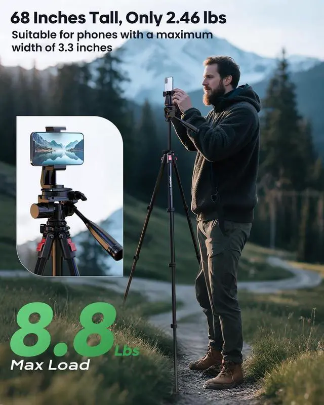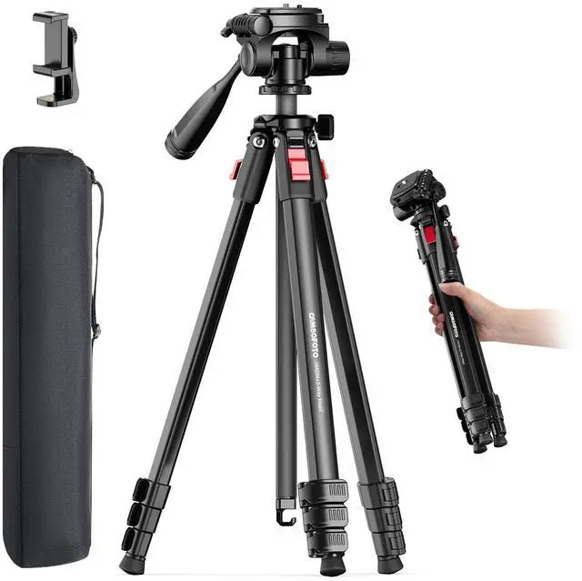 COMPACT TRIPOD FOR TRAVELThis video tripod for camera is made of durable aluminum alloy, weighs just 2.46 lbs, and folds to 21 inches for easy packing. A 7.08" handgrip ensures comfortable one-handed carryideal for vlogs, landscapes, and street shots. ^^ UNIVERSAL TRIPOD FOR SMARTPHONES & CAMERASDesigned for vloggers, livestreamers and creators, this lightweight tripod stand features universal phone mount ( 2.5" 3.3" ) and 1/4" quick-release plate for fast switching between phones, DSLRs, and action cameras. A built-in weight hook adds extra stability outdoors. ^^ STABLE & VERSATILE TRAVEL TRIPODThis adjustable camcorder tripod extends 19.568 inches for tabletop to high-angle shots.