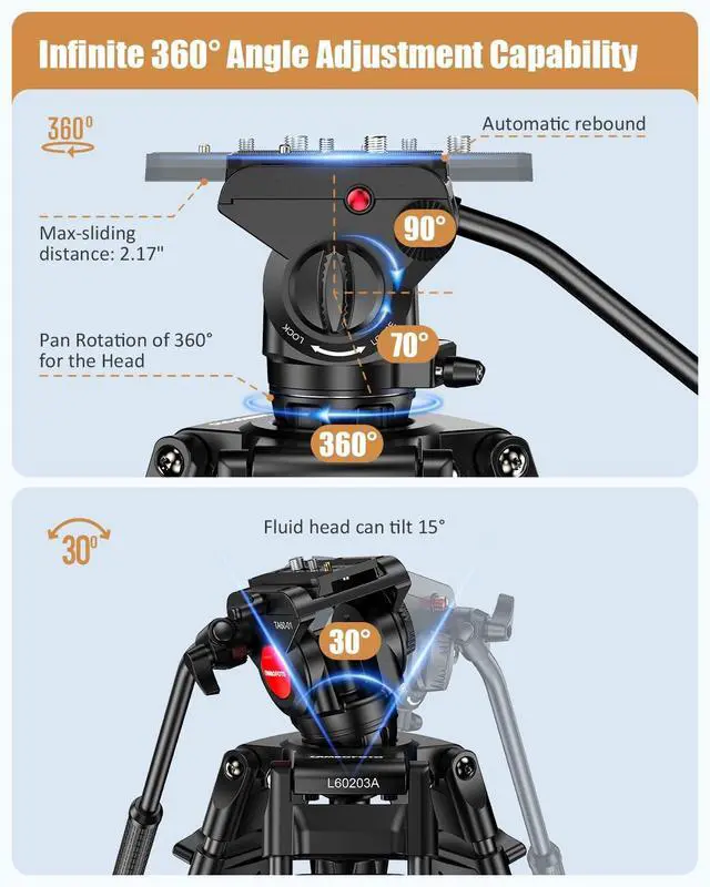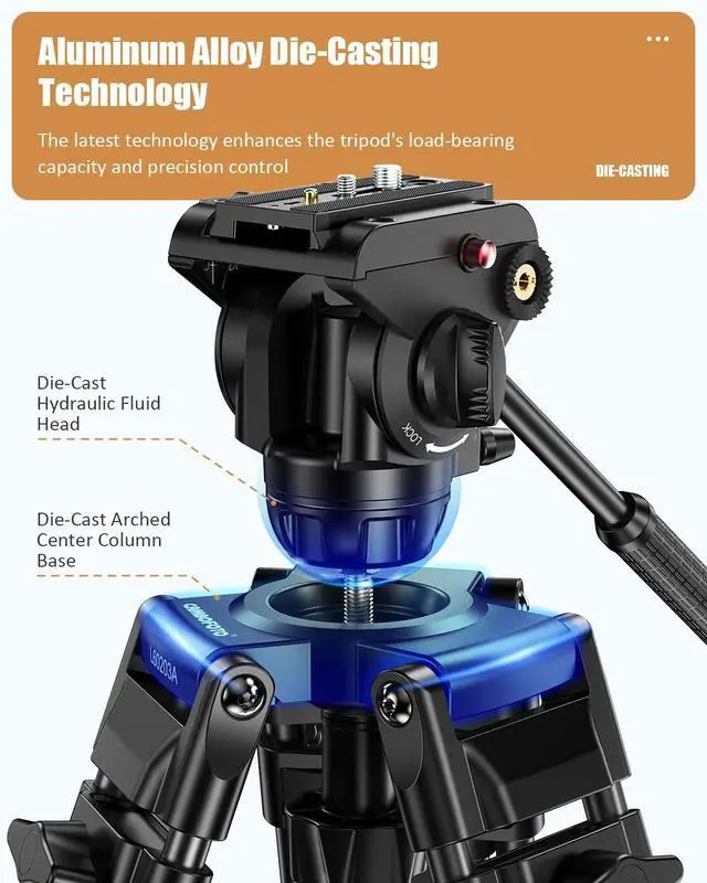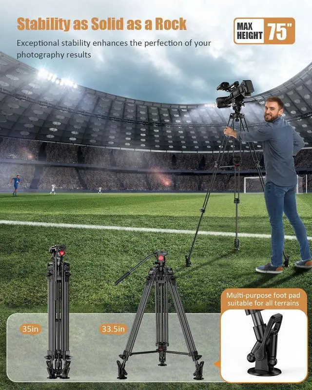 BASIC PERFORMANCEModel: TA60, this Professional grade tripod weighs 9.1 pounds, extends from 36 to 74 inches in height, and can support equipment weighing up to 20 pounds. The tripod is equipped with a hydraulic fluid head, allowing for 360 horizontal rotation and automatic leveling of the tilt angle within a range of -70 to 90. The bowl joint at the base of the head enables a 30 adjustment of the entire head. ^^ WIDE RANGE OF USAGE ENVIRONMENTSThis professional fluid drag tripod features only two quick-release joints on each leg, making it incredibly easy to set up quickly. When the joints are tightened, the tripod becomes exceptionally stable. This tripod is well-suited for supporting cameras with long telephoto lenses, large camcorders, and long-tube telescopes. With this tripod, these large devices can work effectively even in windy outdoor conditions. ^^ PRECISION GIMBAL WITH SMOOTH AND RESPONSIVE MOVEMENTThe horizontal joint is filled with lubricating oil, and the parts connecting the ball-shaped bowl and the gimbal ball are integrally cast and precision-machined on CNC machines, resulting in minimal spherical error and even force distribution on the contact surface.