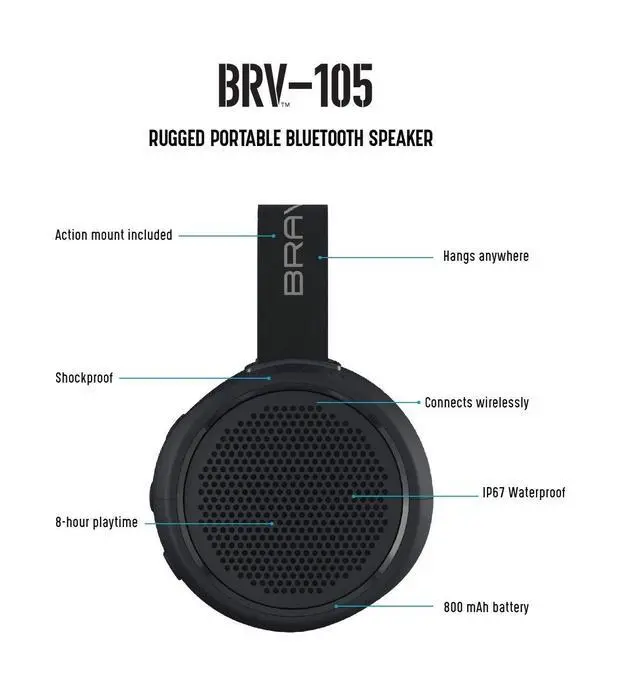 Palm-sized portable speaker blasts full-bodied sound. The brv-105 is IP67 waterproof and designed to withstand rain, waterfalls, and dunks in lakes. The elastic strap or inch thread mount attaches to handlebars, sport accessories and belt loops. Lightweight and durable. Made to move! Internal speakerphone enables hands-free calls with noise-canceling technology for background sound