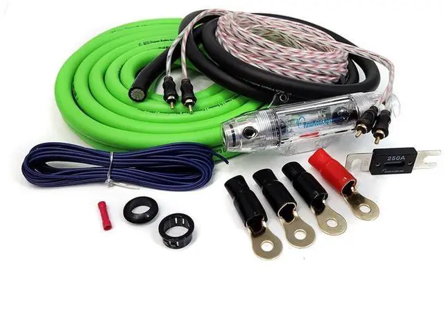 17 Feet KCA 1/0 Ultra Flex Green Power Wire ^^ 5 Feet KCA 1/0 Ultra Flex Black Ground Wire ^^ In line Fuse Holder (FH-20) with 250A Fuse ^^ One 2 Channel Bassik Twisted Pair RCA Cable ( 16.5 ft) ^^ Remoter Wire, Ring Terminals and Split Loom
