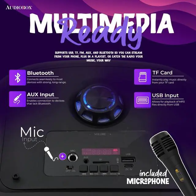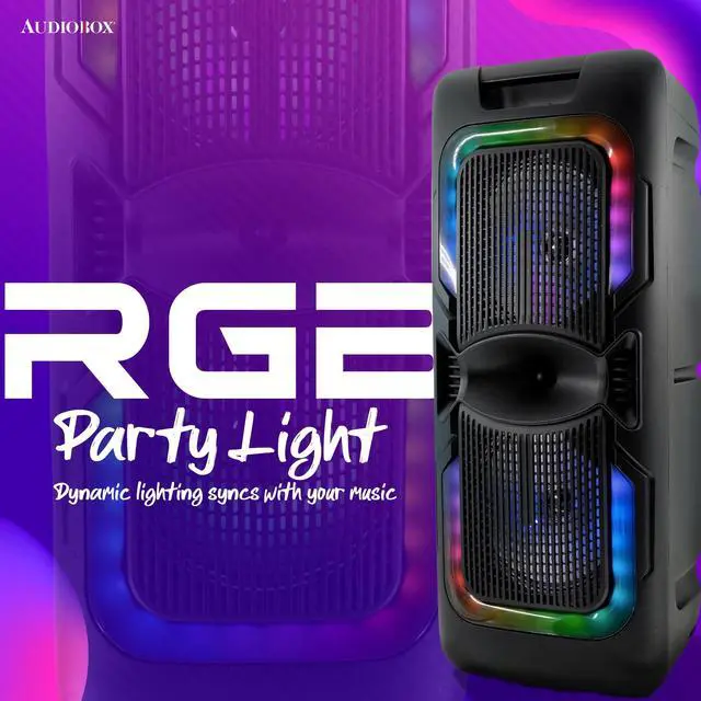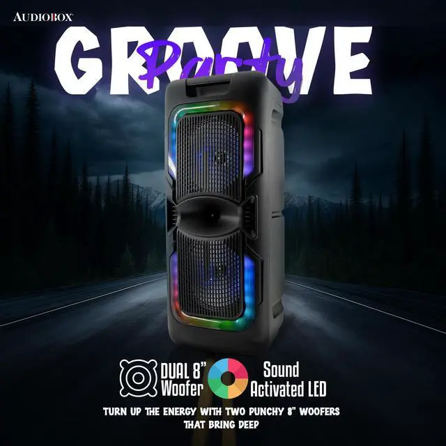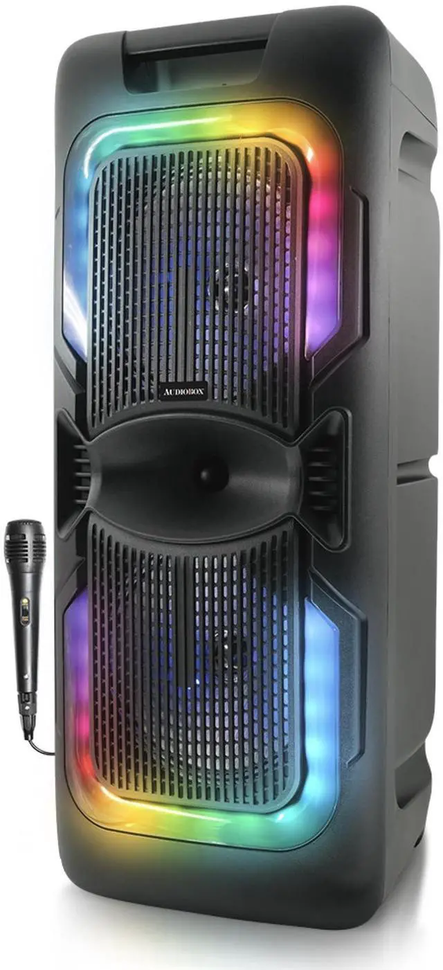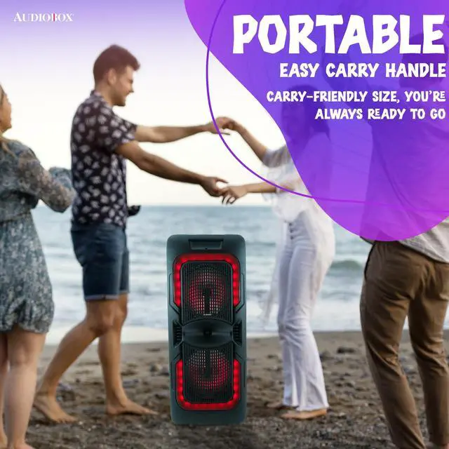 Bring powerful sound and party vibes anywhere with the AudioBox ABX-2085R Portable Party Bluetooth Speaker. Equipped with dual 8-inch woofers, WaveSync Technology (TWS) for pairing two speakers wirelessly, and colorful LED lights, this speaker is made for karaoke nights, outdoor gatherings, and celebrations. Play music from Bluetooth, USB, TF, or AUX, and grab the included wired microphone for instant sing-along fun. With a rechargeable battery and a portable design, the ABX-2085R makes it easy to take the music wherever the party goes.