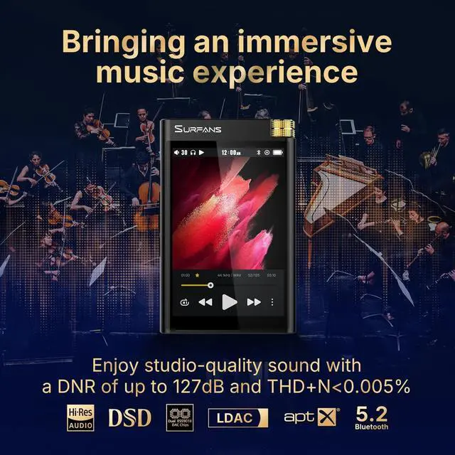 [Dual ESS9018 DAC + X1000E Processor] Native DSD256 ( 11.2MH z) & 384kHz/32-bit PCM support with ultra-low distortion (< 0.005 % THD+N). Studio-grade sound for critical listening. ^^ [Universal Hi-Res Audio Support] Plays all lossless formats: DSD (DSF/DFF), FLAC/WAV (up to 384kHz), AIFF/APE, plus MP3/AAC for casual use. ^^ [Bidirectional Bluetooth (LDAC/aptX HD)] More stable and higher quality. Works as both transmitter (to wireless headphones) and receiver (from phone/PC). Perfect for gym or travel. ^^ [Premium Build with Tactile Controls] 3.5" IPS touchscreen + zinc alloy body. Features ALPS analog knob for precise volume adjustment. ^^ [High-Power Balanced Output & Expandable Storage] 2.5 mm balanced (450mW) + 3.5 mm outputs. 12-hour battery & 512GB expandable (128GB included).