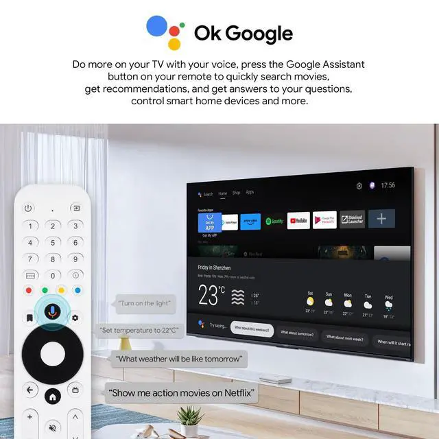 ^^ Voice Assistant: Do more on your TV with your voice. Press the Goo gle Assistant button on your remote to quickly search for movies, get recommendations, get answers to your questions, control smart home devices and more - all with your voice. Just say "OK Goo gle" or press the Goo gle Assistant button on your remote to get started. ^^