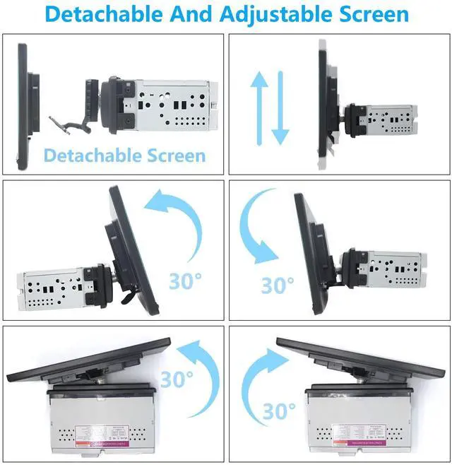 AM/FM Radio & Subwoofer: AM & FM HD radio ready. It will give you more channel choices. You can listen to real-time traffic, news broadcasts, weather forecasts etc. 4-way sound surround with subwoofer function, make the sound of the music in your car more attractive ^^ Detachable And Adjustable &Day and night mode The device has a 360-degree swivel function as well as the ability to fine-tune the screen angle back and forth, allowing you to adjust the angle and screen orientation as neededalso the screen can be detached. The screen automatically adjusts its brightness when the light control cable is connected to provide optimal eye protection when the brightness of external light changes. ^^