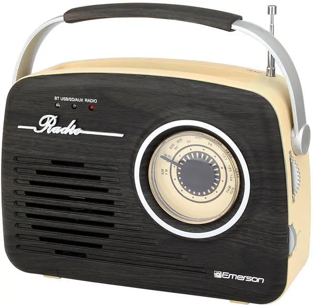 VINTAGE DESIGN WITH MODERN FEATURES -- The Emerson EAS-3002 Portable Bluetooth Retro Radio combines classic aesthetics with contemporary technology. Its retro styling brings a nostalgic touch to any space, while its advanced features ensure a modern listening experience. ^^ BLUETOOTH CONNECTIVITY FOR WIRELESS STREAMING -- Stream your favorite music wirelessly from any Bluetooth-enabled device. The Emerson EAS-3002 allows you to connect your smartphone, tablet, or laptop effortlessly, providing you with high-quality, cord-free audio wherever you go. ^^ BUILT-IN RECHARGEABLE BATTERY FOR PORTABLE USE -- Take your music on the go with the built-in rechargeable battery.