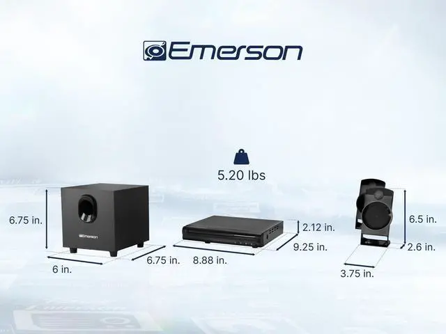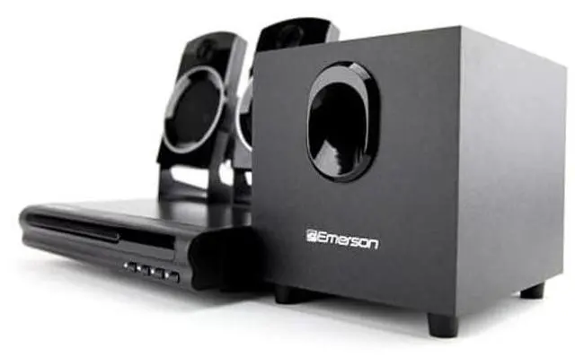 ENHANCE YOUR HOME ENTERTAINMENT WITH THE EMERSON 2.1 CHANNEL DVD PLAYER AND SPEAKER SYSTEM -- Bring the cinema experience to your living room with this versatile and powerful DVD player and speaker system, delivering immersive audio and crystal-clear video. ^^ 2.1 CHANNEL AUDIO FOR IMMERSIVE SOUND -- Enjoy rich, full-bodied sound with the 2.1 channel audio system, featuring two satellite speakers and a subwoofer for deep bass. ^^ 1080P UPSCALING FOR SHARPER VIDEO QUALITY -- Experience your DVDs in stunning clarity with 1080p upscaling, providing enhanced video resolution for a more detailed viewing experience.